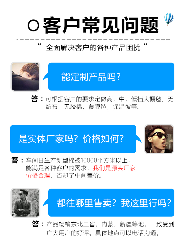 本公司設備齊全,可生產智能大棚骨架,彎管機,暖風爐等農業(yè)設備,另制造棉被生產自動化設備,自動上料機,輸棉機,絎縫機等。質量可靠,注重創(chuàng)新。公司擁有雄厚的實力,先進的生產線,豐富的經驗,可根據客戶的要求定做高,中,低檔大棚氈,無紡布,無膠棉,覆膜氈,保溫被等,車間日生產新型棉被10000平方米以上,能滿足各種客戶的需求,新型保溫被產品在國內研發(fā)中始終保持在前列。